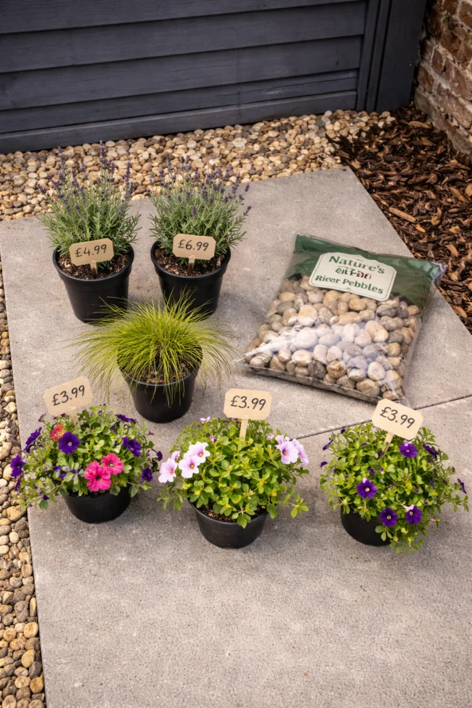 That left $47 for plants. This is where I made my smartest decision of the whole project. I went to the garden centre on a Sunday afternoon, when they mark down anything that looks slightly stressed. I came home with: