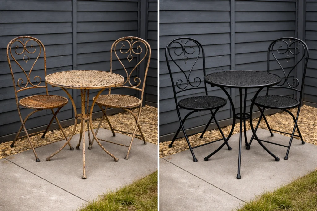 I want to be honest about furniture: you cannot buy outdoor furniture for $82. What you can do is find it. I spent two evenings scrolling Facebook Marketplace and found a small wrought iron bistro table with two chairs for $35. One chair had a wobbly leg I fixed in five minutes with a wrench. I spray-painted both chairs and the table with the leftover matte black spray paint, and they looked brand new.