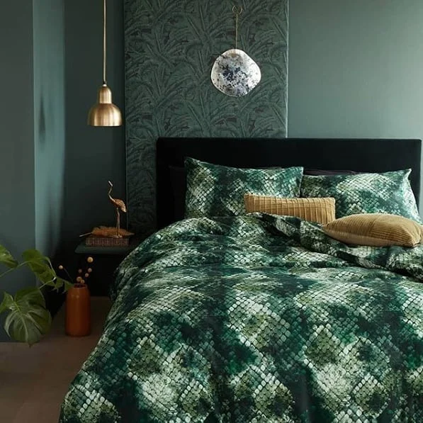 Here, deep green snake-print bedding sets the stage for a moody and stylish bedroom. The scales-inspired pattern adds texture and depth, beautifully paired with dark green walls and a gold pendant lamp.