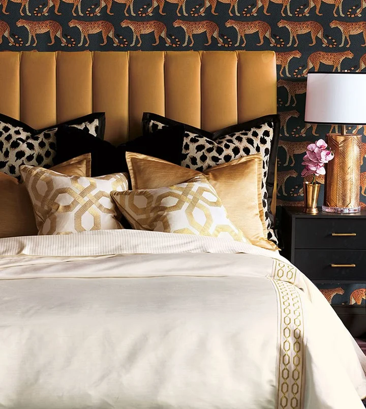 Rich gold tones and leopard-print details give this bedroom a glamorous finish. The upholstered headboard and velvet cushions add elegance, while the bold wallpaper brings personality and flair. Paired with dark furniture and metallic touches, the space feels both stylish and inviting.