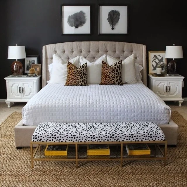 A neutral tufted headboard and crisp white bedding set the perfect stage for playful animal print accents. Leopard pillows bring a lively touch, while the spotted bench adds a creative twist.