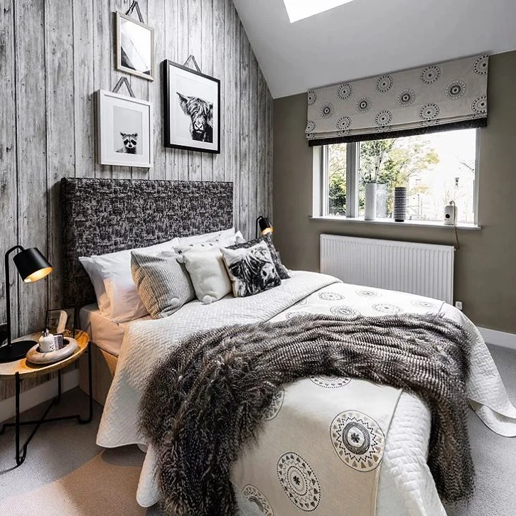 This cozy setup uses subtle animal prints through soft cushions and decor while embracing rustic textures. A faux fur throw adds warmth on crisp white bedding, while wood panel walls bring a natural vibe.