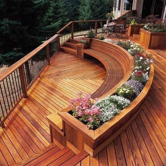 This deck feels creative and warm. The curved wooden bench adds a natural flow that makes the space feel inviting and unique. I love how the built in planters soften the wood with flowers and greenery. The rich wood tones feel cozy and welcoming underfoot. It looks like a place where people naturally sit down and stay awhile, enjoying the view, the breeze, and the comfort of a well loved outdoor space.