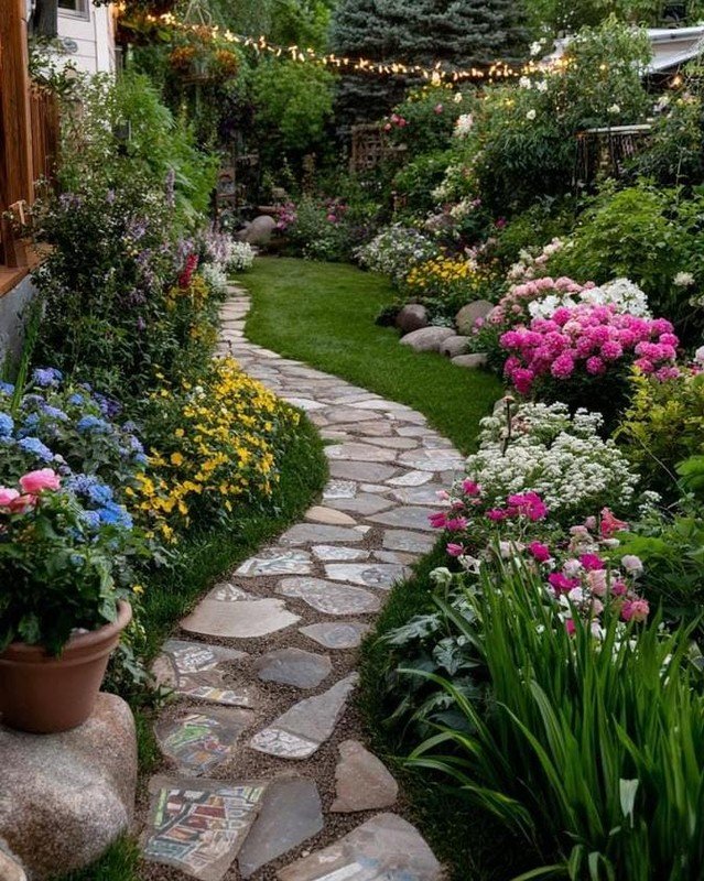 This garden walkway feels like something out of a storybook. I love how the stone path gently curves through layers of flowers in soft pinks, yellows, blues, and greens. Everything feels full and alive, yet still calm and welcoming. The plants spill naturally onto the path, making it feel intimate and cared for. It looks like the kind of place where you’d walk slowly on purpose, enjoying the scent of flowers and the quiet beauty around you.