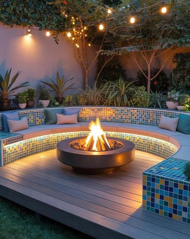 This deck feels playful and warm at the same time. The curved seating wrapped around the fire pit makes the space feel social and inclusive, like everyone has a good seat. I love the mix of colors in the tile and cushions they add personality without overwhelming the space. The string lights above bring a soft glow that feels relaxed and welcoming. It looks like the kind of place where evenings naturally turn into long conversations and shared moments around the fire.