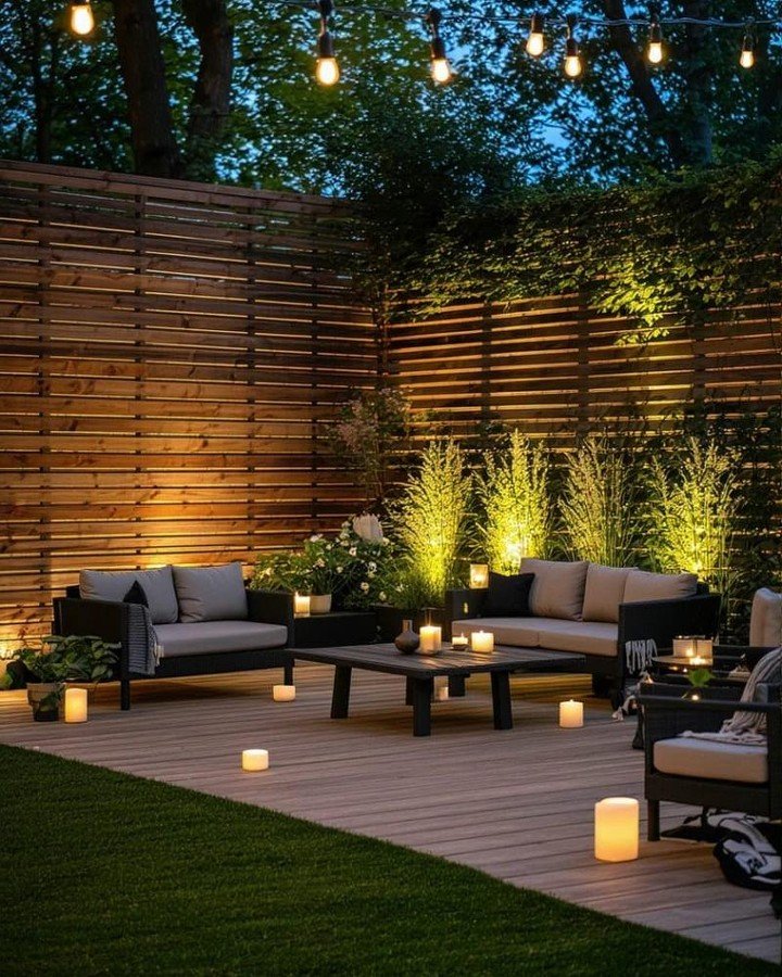 Soft string lights, lanterns, and low step lighting work best. They create warmth without feeling harsh or bright.