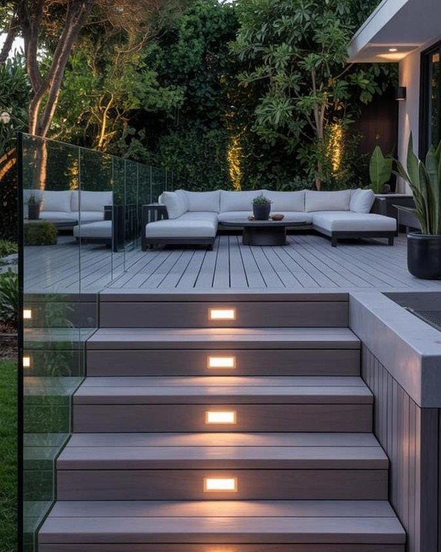This deck feels calm and modern in the best way. The built in lighting along the steps gives off a gentle glow that makes the space feel safe and cozy at night. I love how the seating area feels slightly elevated and tucked in, creating a relaxed lounge vibe. The neutral colors keep everything peaceful and balanced. It looks like the kind of place where evenings feel quiet and comforting, perfect for unwinding at the end of the day.