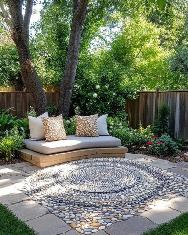 This nook feels peaceful and grounding. The circular stone pattern on the ground instantly pulls your attention and makes the space feel intentional. I love how the low seating blends into the garden instead of standing out. The surrounding trees and greenery give shade and privacy, making it feel like a quiet escape. It looks like the perfect spot for reading, quiet talks, or simply sitting still and enjoying the calm energy of the space.