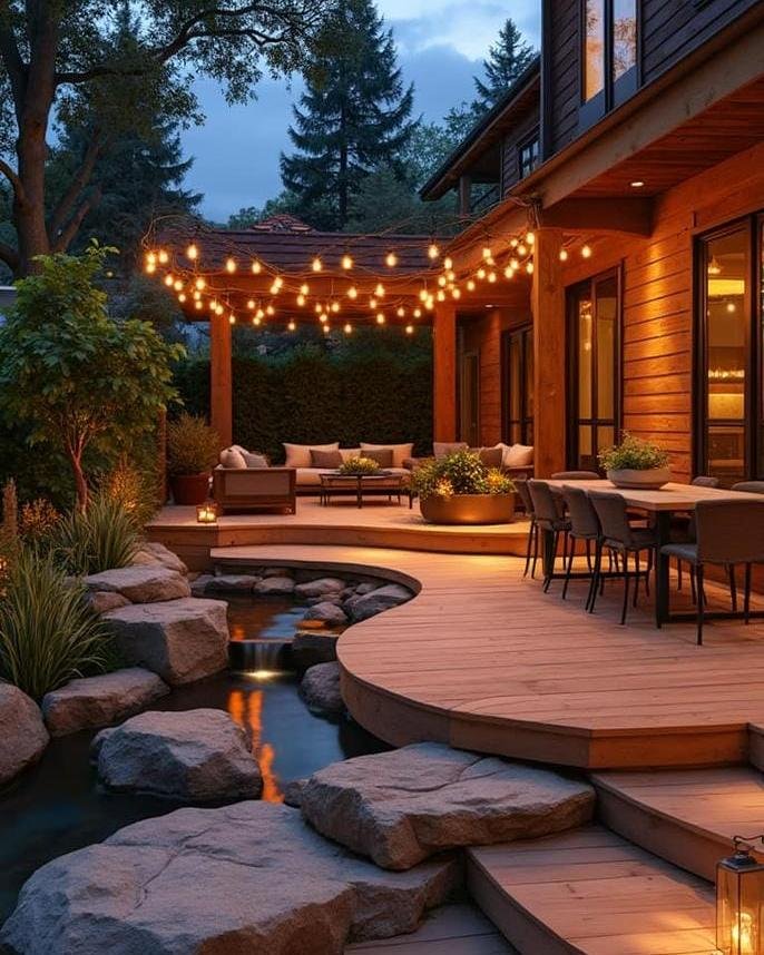 This deck feels magical the moment the lights turn on. I love how the soft string lights hang overhead, creating a warm glow that instantly makes the space feel inviting. The curved deck edge adds a gentle flow, especially next to the water feature that reflects the light beautifully. The seating looks comfortable and relaxed, perfect for long dinners that stretch into the evening. It feels like a place where conversations linger and everything feels slower and more connected.