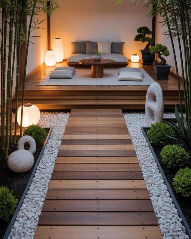 The bamboo and sculptural greenery frame the space beautifully, making it feel tucked away and private. It looks like the kind of place where you’d sit barefoot in the evening, sipping tea, letting the day slow down while everything feels balanced and still.