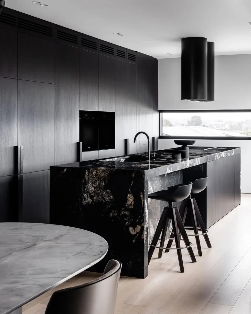 17. Black Kitchen with Dramatic Stone Island and Hidden Storage