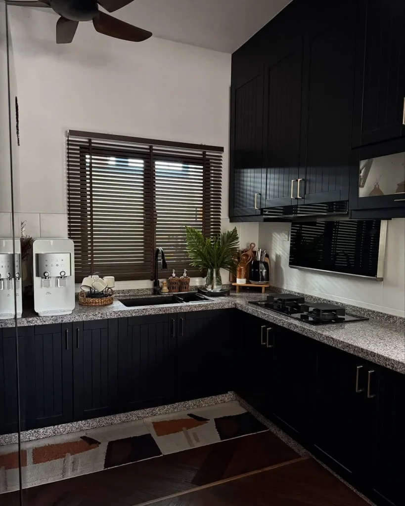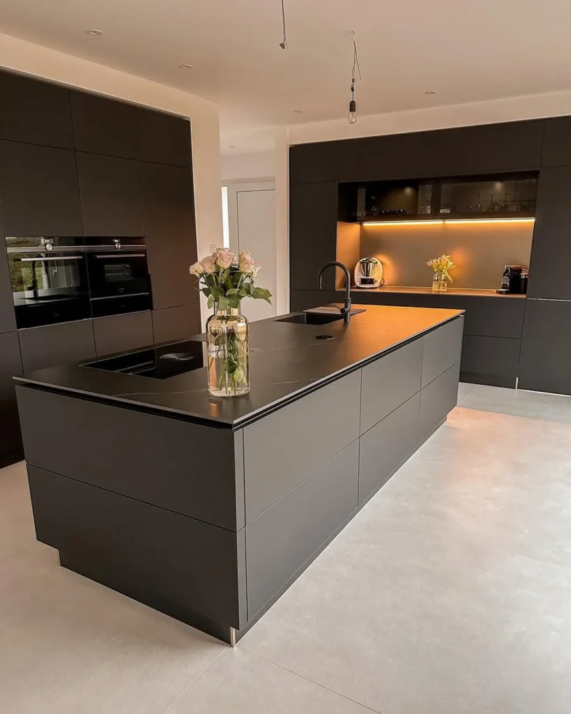 Here’s a refined black kitchen that blends minimalism with coziness. Flat-panel cabinetry and a clean-lined island give off a seamless vibe, while the amber under-cabinet lighting adds a soft glow. Neutral flooring and soft floral accents break up the monochrome, creating a welcoming space that feels luxurious but lived-in.