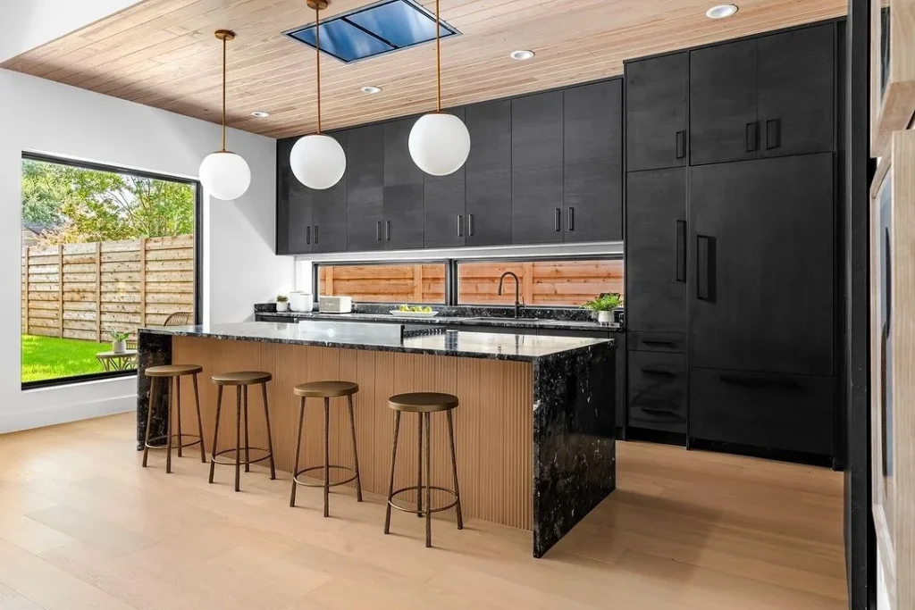 This kitchen nails the high-contrast look with black cabinetry, a marble-top island, and ribbed wood details below. The large window brings in tons of natural light, enhancing the cozy yet modern feel. Brass fixtures, globe pendants, and a wood-paneled ceiling complete the stylish, high-function design.
