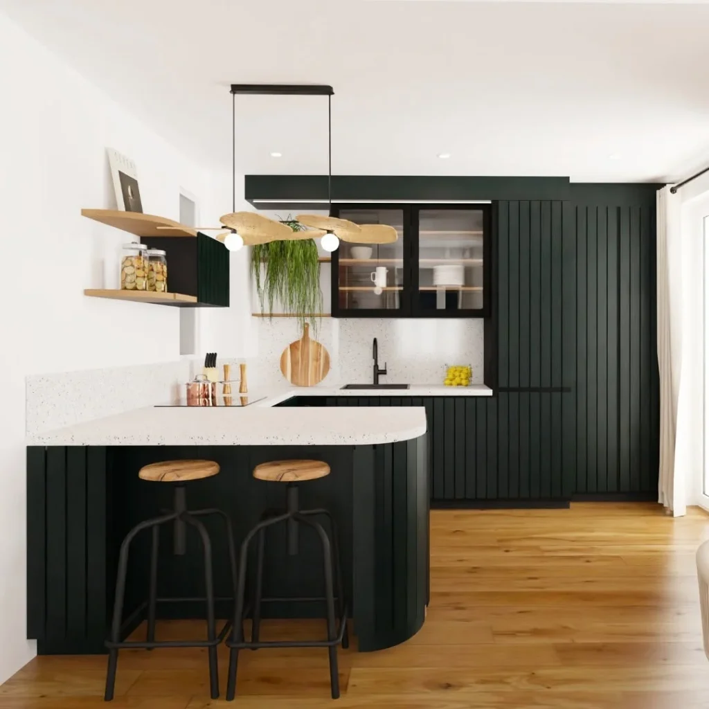 This design plays with shape and texture to create a fun and functional kitchen. Vertical grooves on the cabinetry and island add depth, while soft curved corners make the layout feel approachable. Light wood stools and terrazzo counters balance the bold black with a natural, airy vibe. The playful light fixture above is the cherry on top.