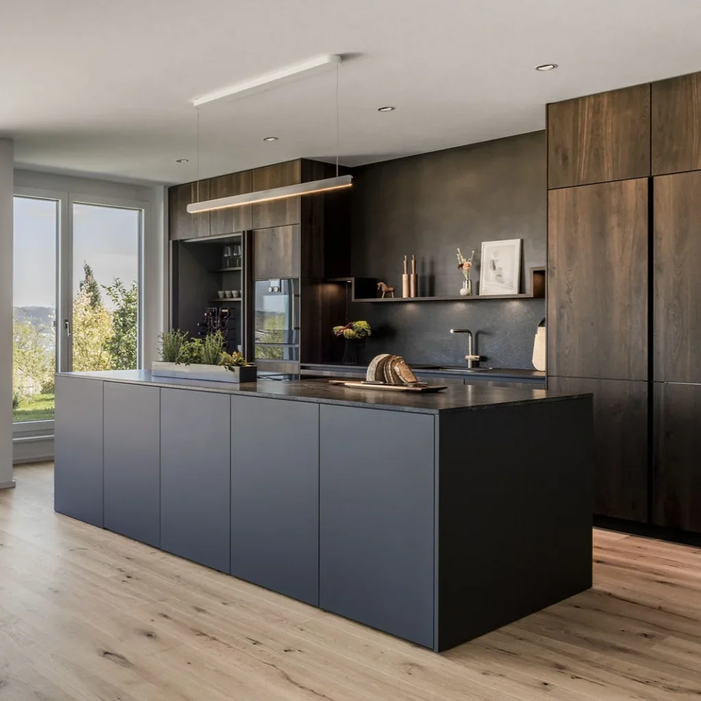 If you’re drawn to modern minimalism, this kitchen nails the look. Jet black cabinetry and a seamless island pair effortlessly with a white countertop and light wood floors. The absence of hardware creates a clean, linear aesthetic. Overhead pendant lights and hidden appliances make this space feel open, functional, and effortlessly sophisticated.