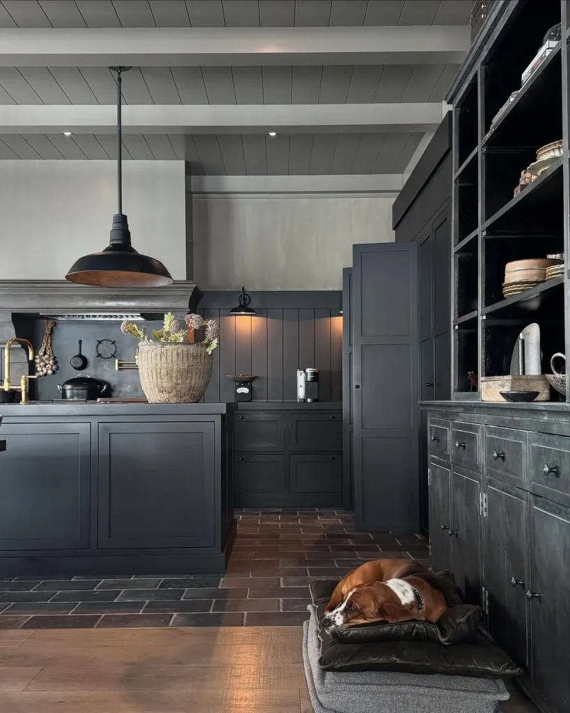 A true moody escape, this kitchen blends farmhouse charm with modern sensibility. Black cabinetry, dark tiled flooring, and rustic open shelving create depth and texture. The golden accents and earthy decor—like the woven basket and ceramic details—infuse warmth. Bonus charm: the sleeping pup cozied up near the island.