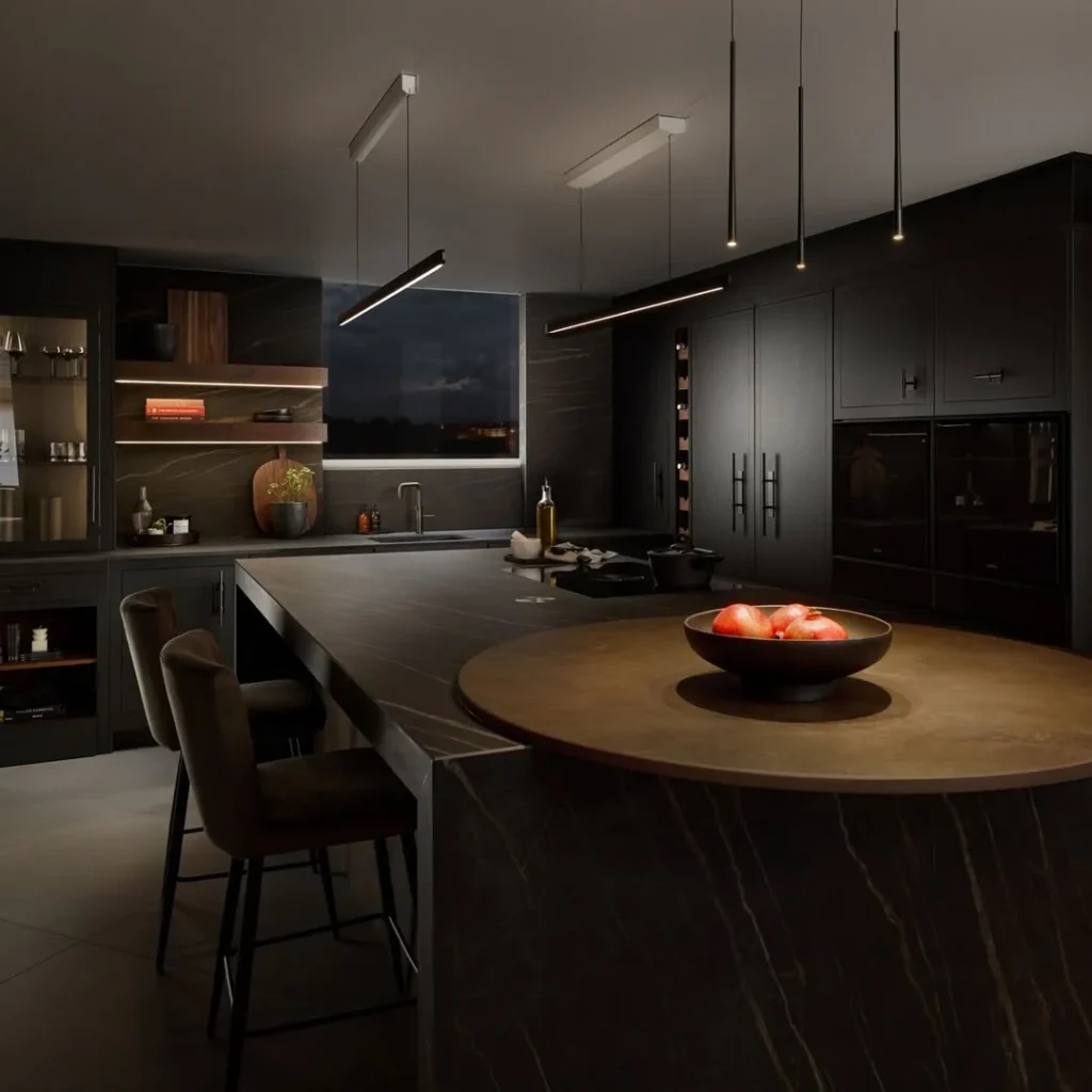 This kitchen brings a luxury lounge vibe to your home. Rich black cabinetry pairs beautifully with bronze countertops and dark marble patterns. The ambient lighting and glass-front shelves give the space depth and warmth, while sculptural pendants add a finishing touch. It’s the definition of moody sophistication.