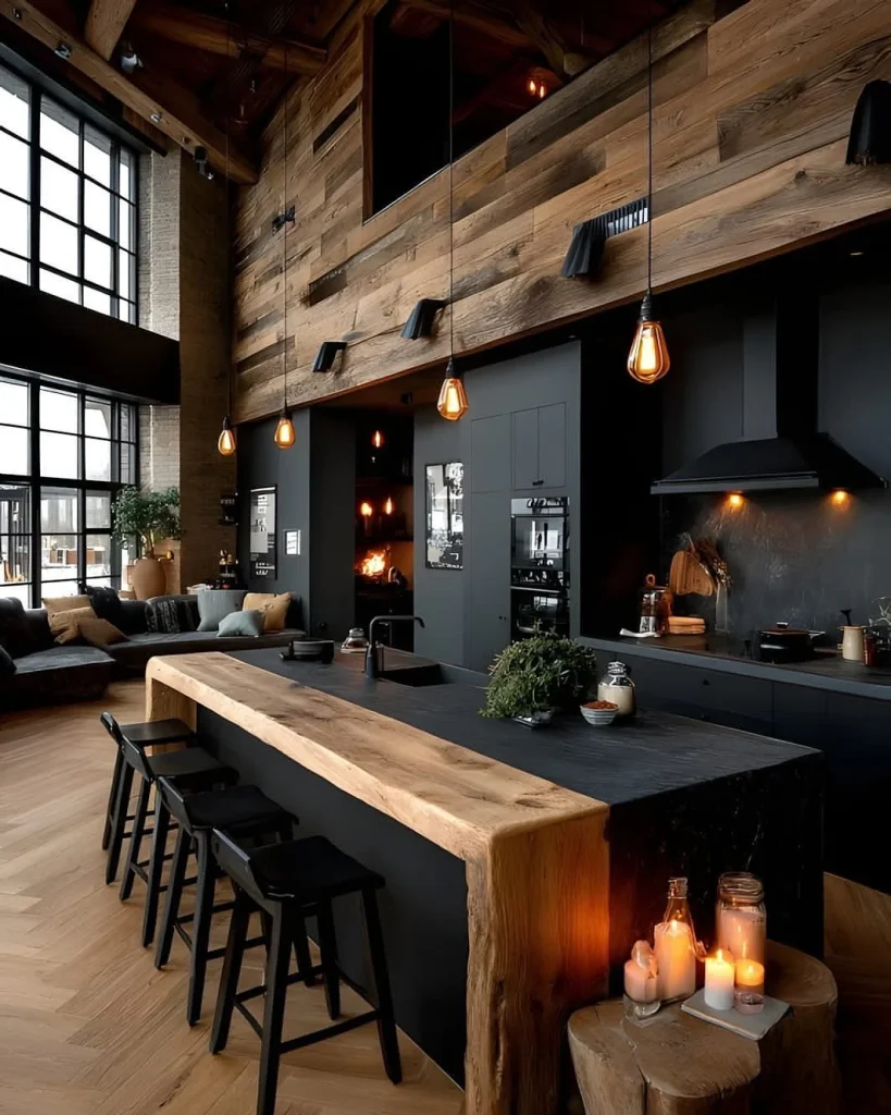 This black kitchen makes a powerful statement with its mix of rustic and industrial design. The reclaimed wood walls, exposed beams, and black cabinetry work in perfect harmony.