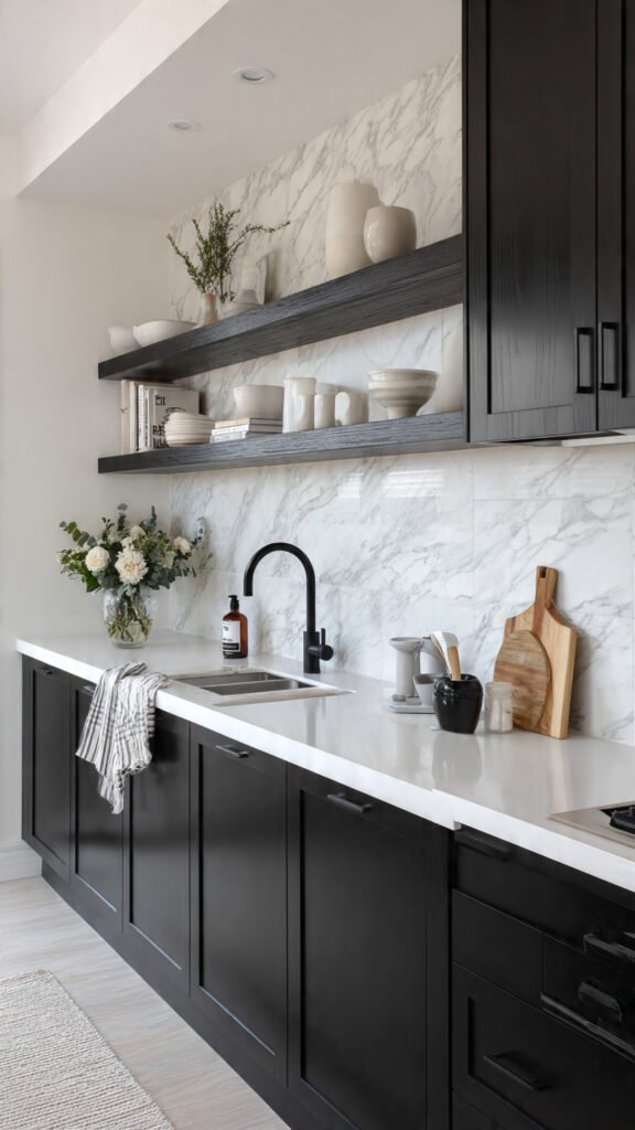 Open wooden shelves and soft lighting add charm and practicality. It’s a beautiful blend of dark minimalism and rustic warmth—perfect for anyone who wants their black kitchen to feel grounded and stylish.