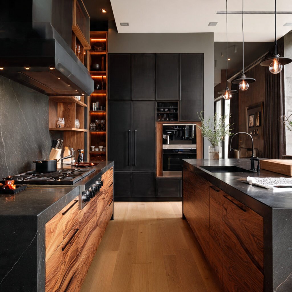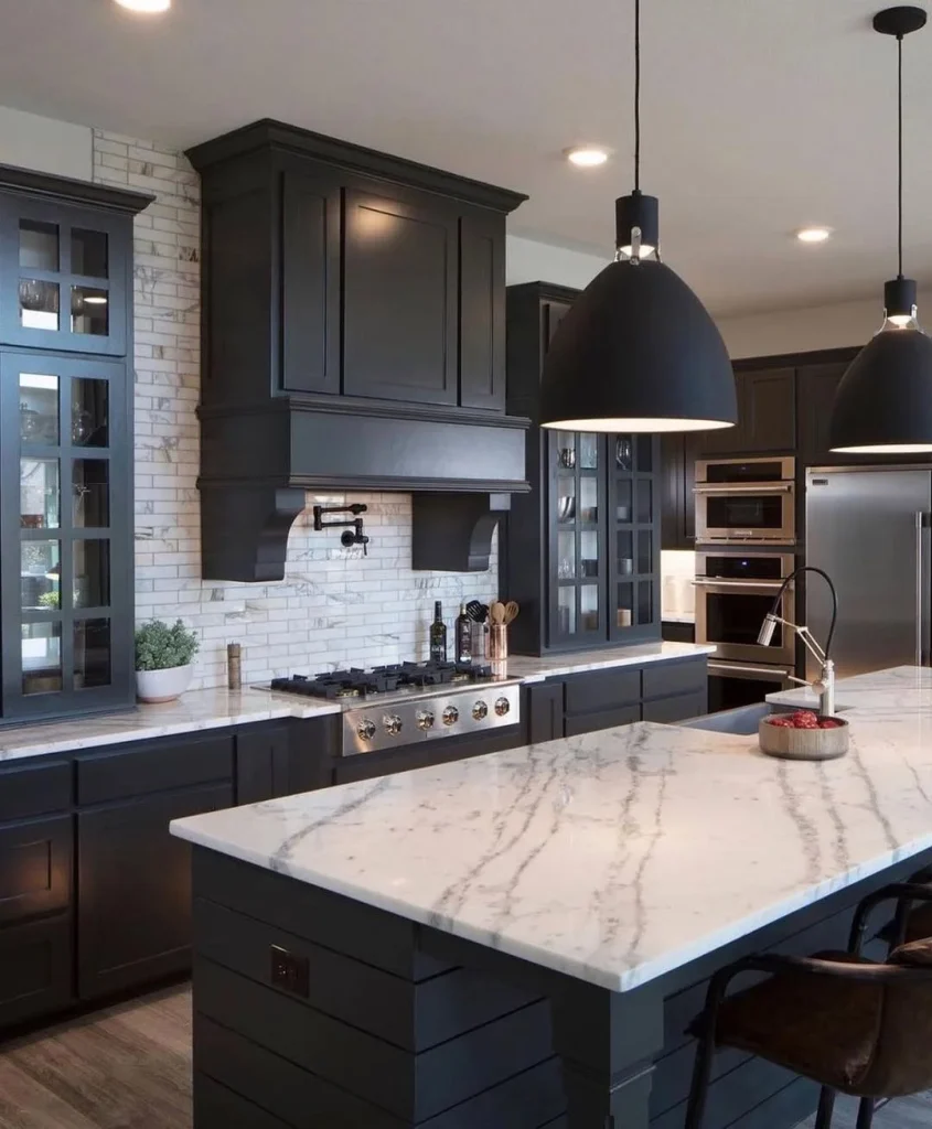 This design blends classic and modern styles. Deep black cabinetry, marble countertops, and brushed silver fixtures create a luxurious atmosphere. Statement pendants and built-in lighting under the hood add a soft ambiance. The layout is perfect for cooking and entertaining, offering beauty and practicality in equal measure.