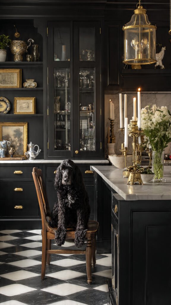 Channeling classic charm, this black kitchen features brass hardware, glass-front cabinets, and a striking checkerboard floor. A soft marble countertop and rich styling touches—like candlesticks and vintage dishware add layers of personality. With a loyal pup lounging nearby, this space feels both elegant and lived-in.