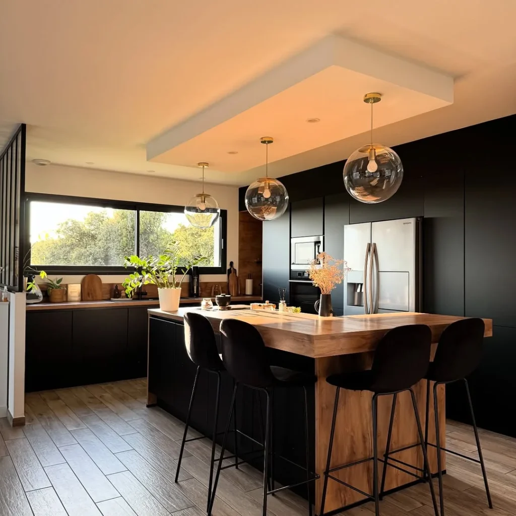 Flooded with natural light, this kitchen proves that black doesn’t have to feel dark. A large wooden island doubles as a dining table, while brass pendant lights add elegance. The matte black cabinetry blends into the background, allowing greenery and wood textures to shine. It’s modern, grounded, and full of life.