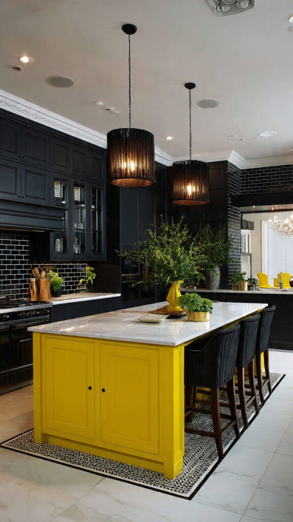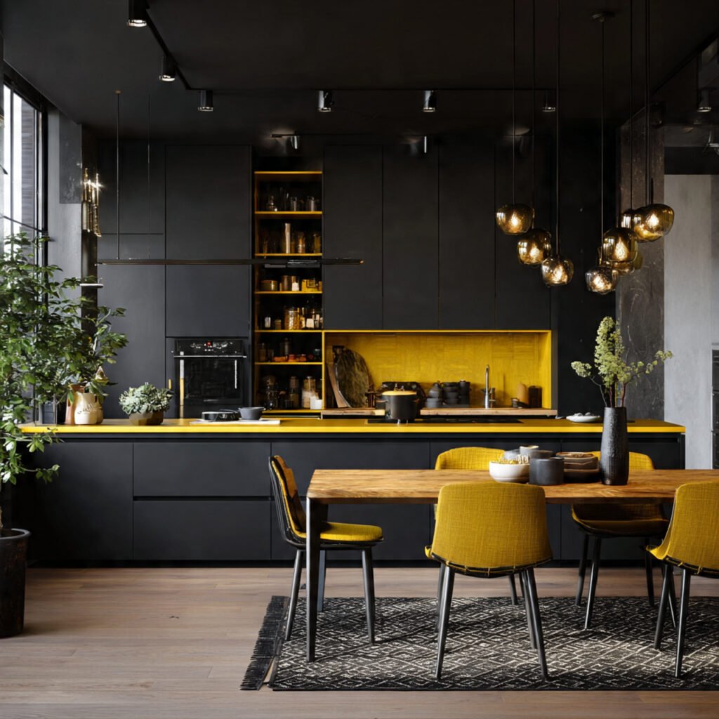 19. Black Kitchen with Mustard Yellow Accents and Chic Lighting