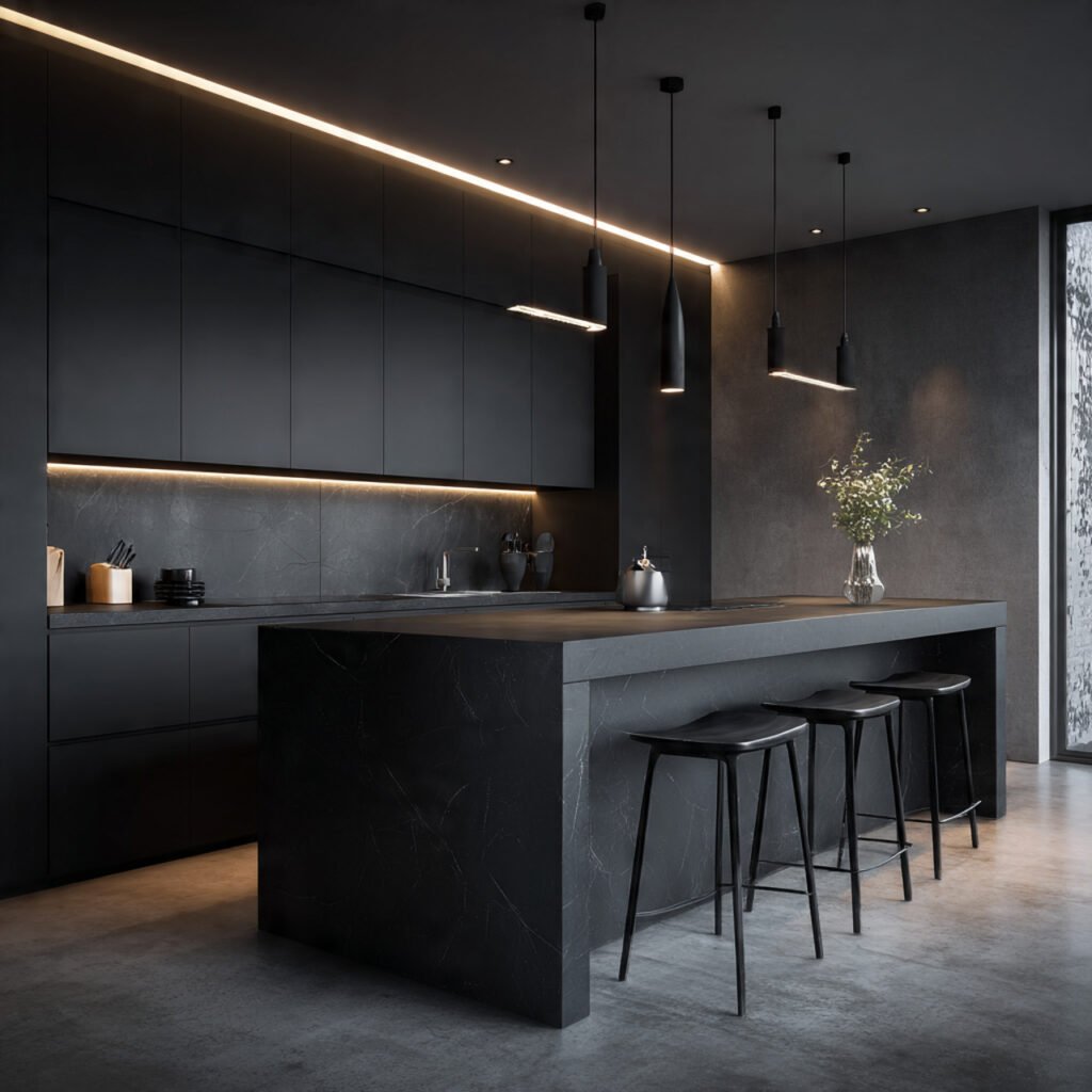 This kitchen is the definition of modern minimalism. Matte black cabinetry runs wall-to-wall with no visible handles, creating a smooth, seamless look. A textured black island with matching fixtures anchors the space. The pendant lighting above adds rhythm and elegance, while the fresh flowers bring a soft, natural balance.
