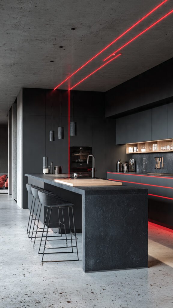 11. Ultra-Modern Black Kitchen with Matte Finishes and Ambient Light