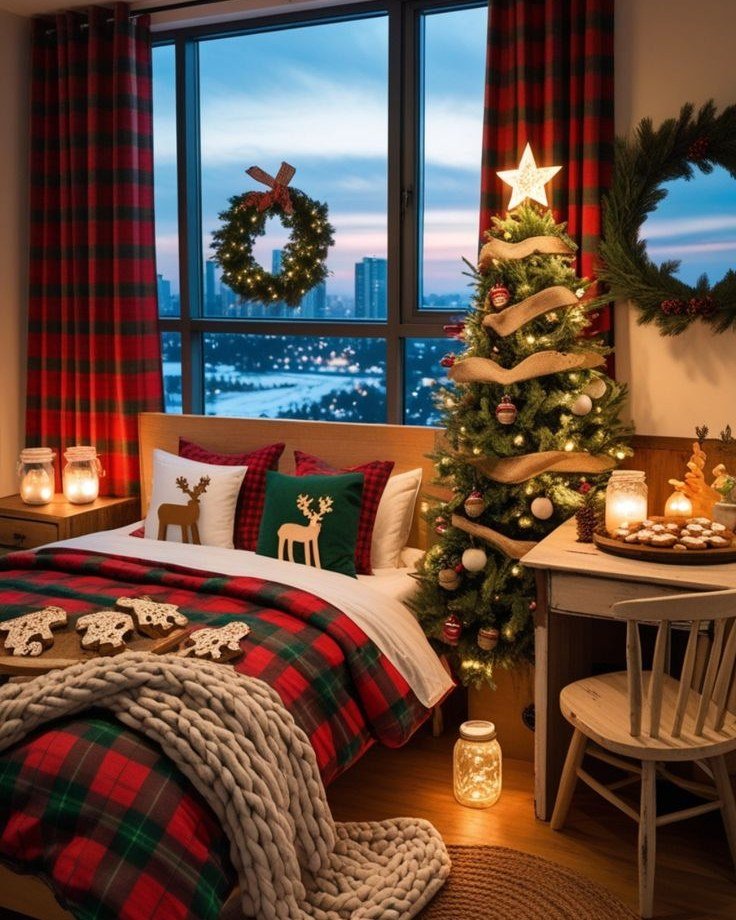 This room feels cozy and festive while still feeling modern. The Christmas tree near the window adds warmth against the city view outside. I love how the plaid bedding and knit blanket create texture and comfort. The small table with candles makes the space feel intimate. It feels like the perfect bedroom for enjoying quiet holiday nights in the city.
