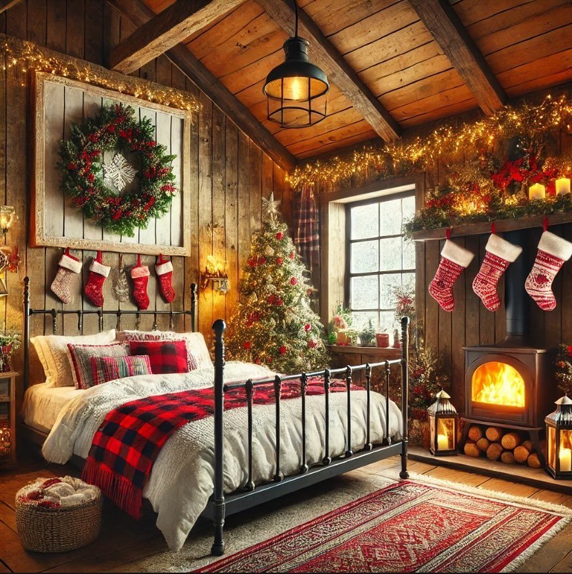 This room feels warm and traditional, with plaid patterns setting the tone right away. The bedding, ribbons, and stockings all work together to create a cozy holiday look that feels timeless. I love how the Christmas tree is decorated with matching red accents, tying the whole room together. The fireplace area adds extra warmth and makes the space feel inviting. It looks like the kind of bedroom where everything feels calm, familiar, and comforting.