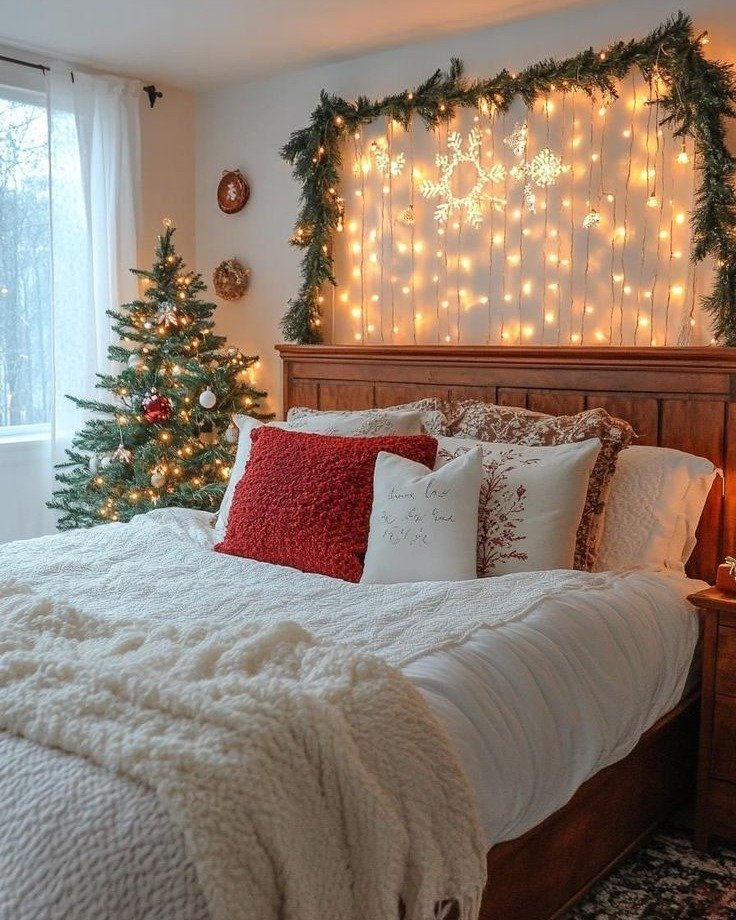 This room feels gentle and welcoming, especially with the warm lights hanging behind the headboard. The white bedding looks plush and soft, layered with touches of red that add warmth without feeling bold. I love how the small Christmas tree sits quietly by the window, adding just enough sparkle. The whole space feels peaceful and comforting. It looks like the kind of room where nights feel extra quiet and mornings feel slow and cozy.