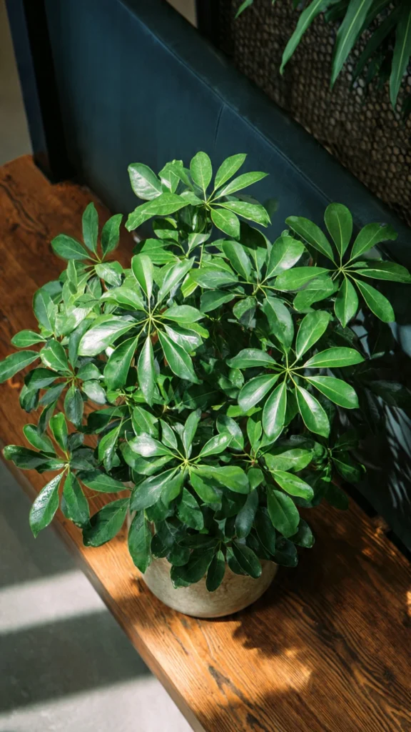 The schefflera gets its nickname from its distinctive leaves, which radiate outward like the spokes of an umbrella. A mature plant can grow 6 to 8 feet tall indoors and develops a beautiful, tree-like canopy over time.
