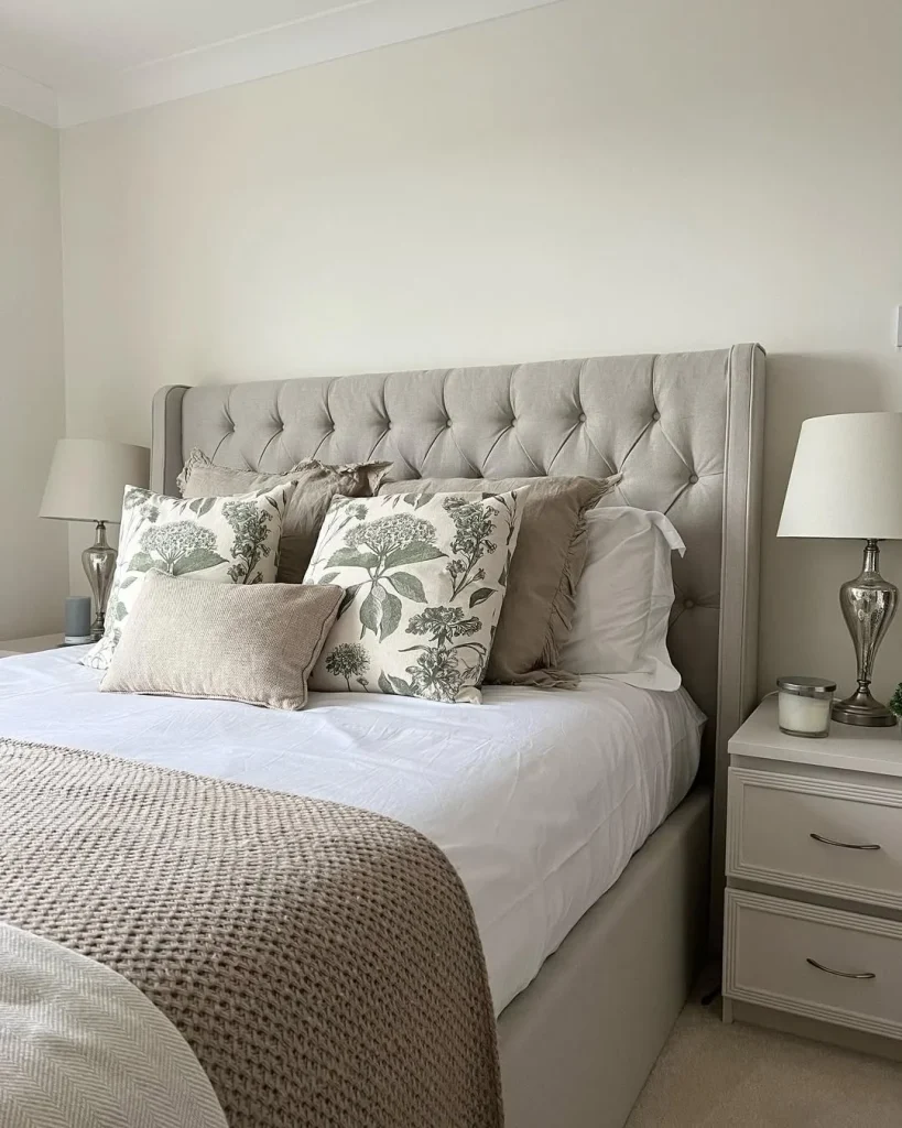 A light grey wingback headboard sets a cozy tone in this warm and earthy bedroom. Creamy walls and taupe accessories give it an inviting, natural feel.