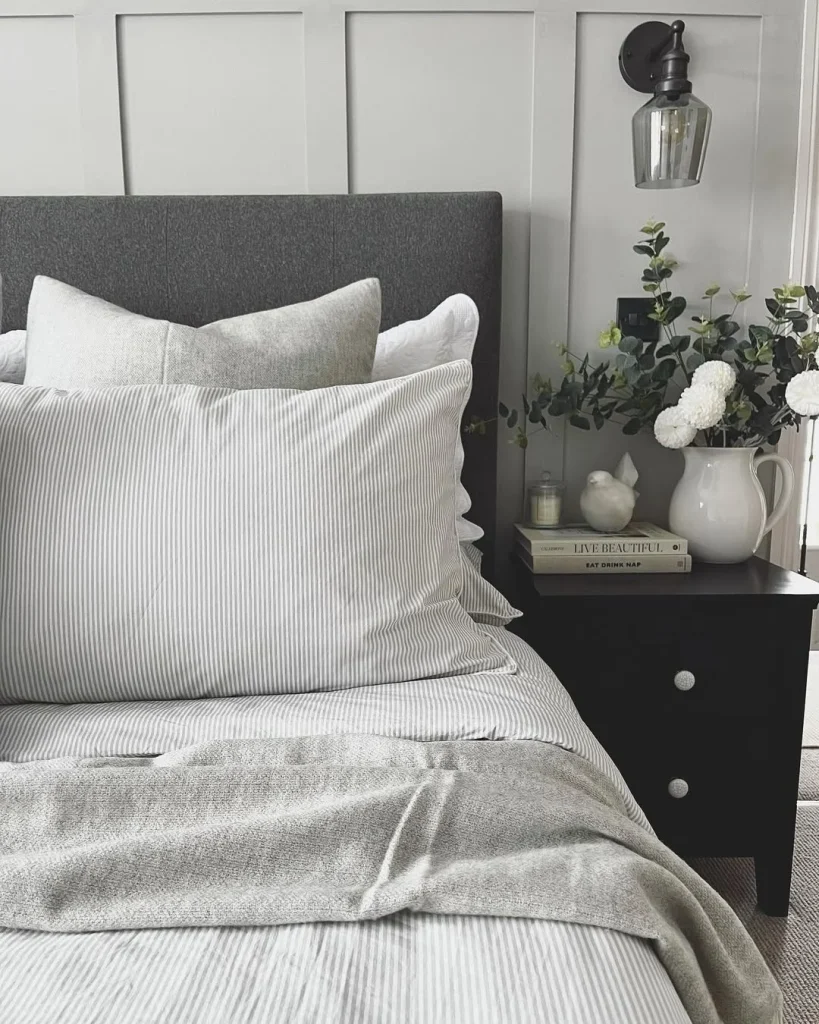 The bedding is crisp and light, with a draped throw adding that just-right level of coziness. It’s a perfect grey bedroom for those who appreciate clean design and soft finishes.