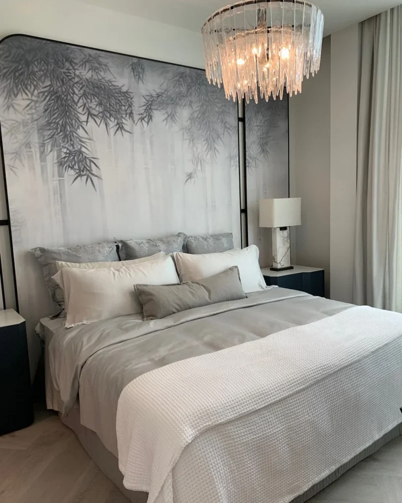 Behind the bed, a bamboo-inspired mural introduces nature in an artistic way. Sculptural lighting and sleek black nightstands add a modern touch, balancing tranquility with contemporary style.