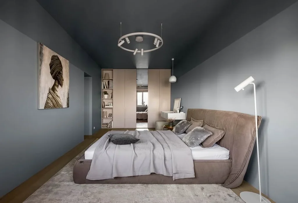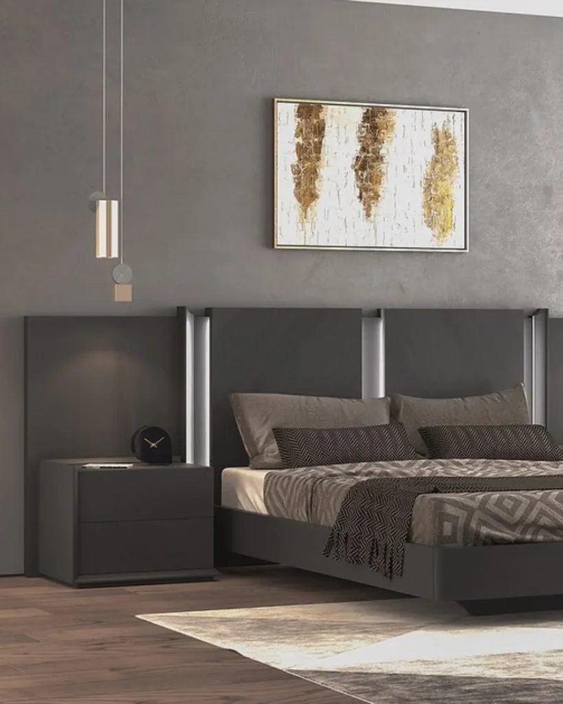 A suede brown headboard softens the bold color palette, while layers of grey bedding add depth. The sculptural lighting and built-in storage make this room stylish, moody, and highly functional.