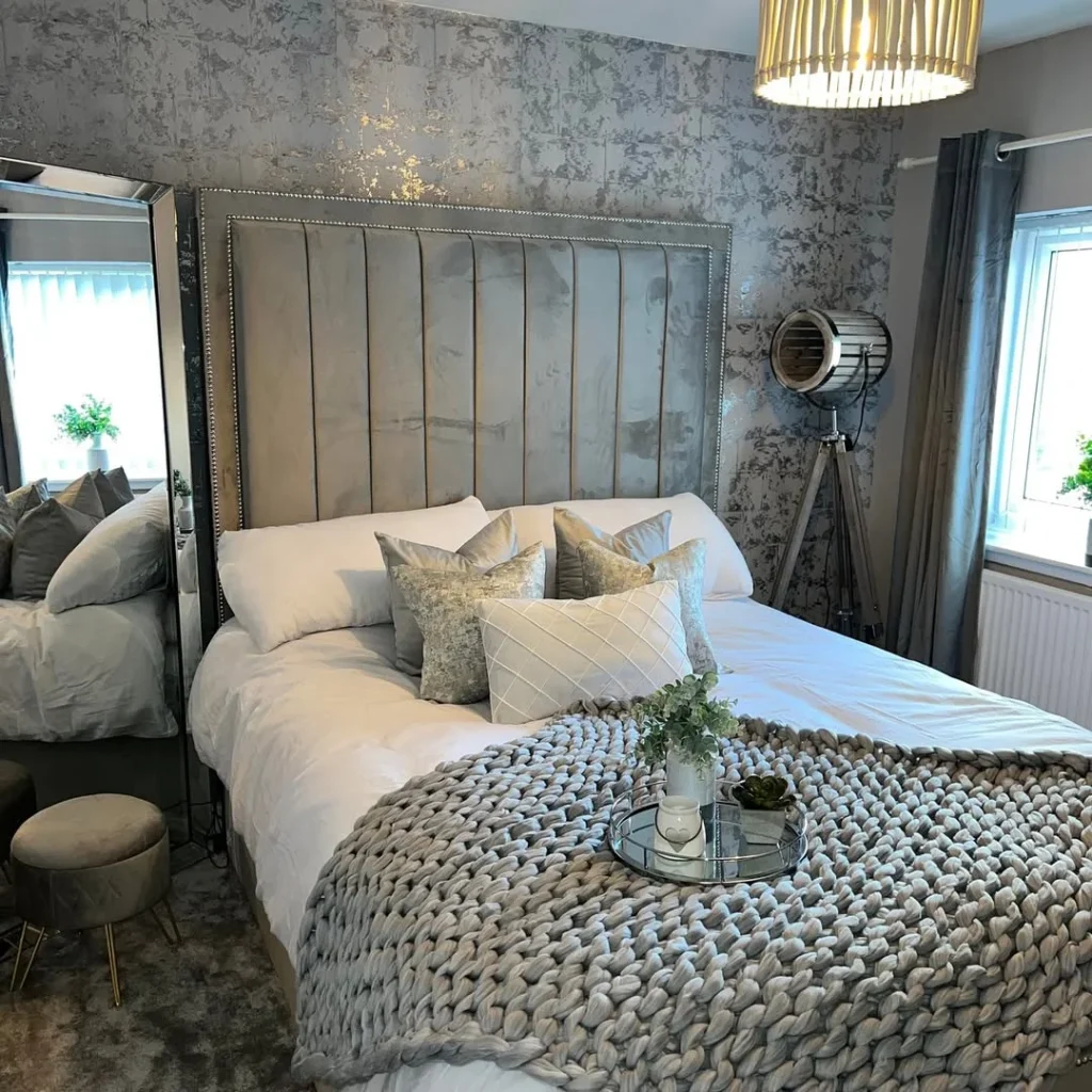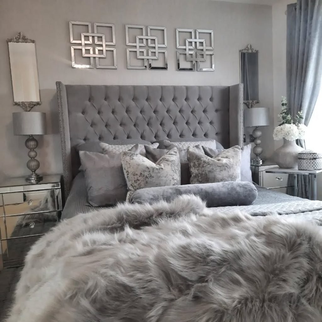 For those who love sparkle and softness, this grey bedroom hits all the marks. A tall wingback velvet headboard steals the spotlight, surrounded by mirrored side tables and silver-toned decor.