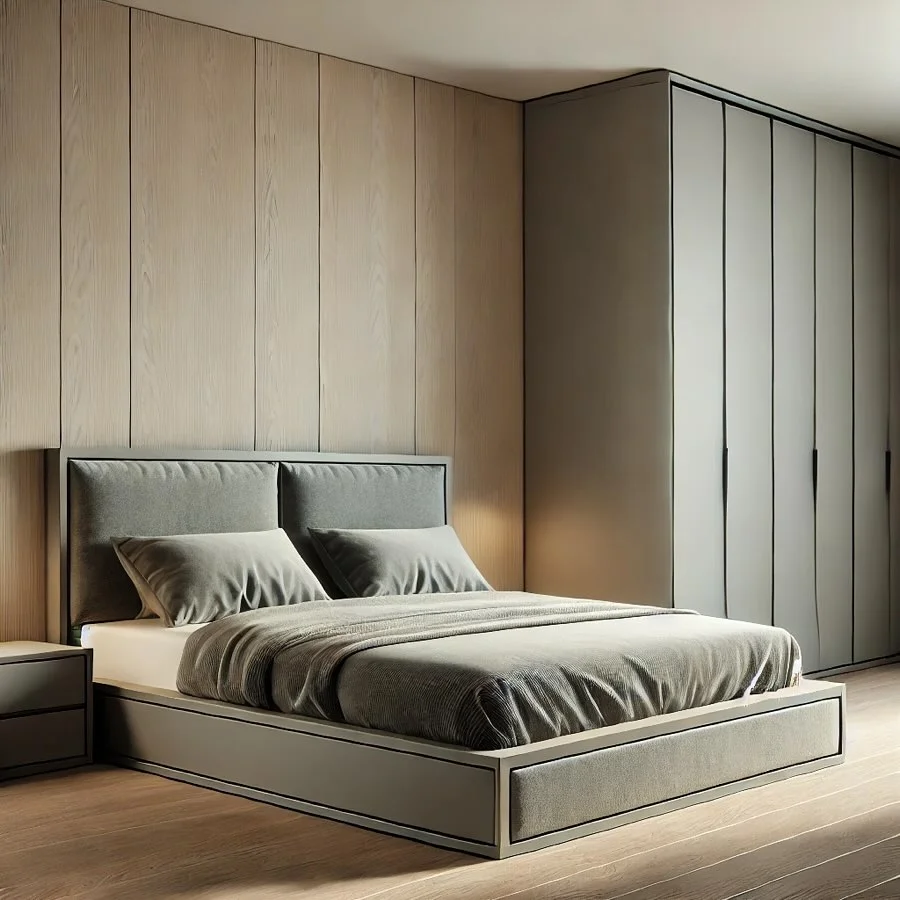 This modern bedroom uses a soft grey palette from top to bottom. The standout feature is the vertical-paneled headboard that adds bold structure without overwhelming the room.