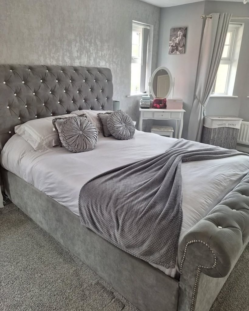 This bedroom goes full glam with luxurious textures and soft sparkle. A plush grey velvet frame features decorative buttons and metallic studs, instantly drawing attention.