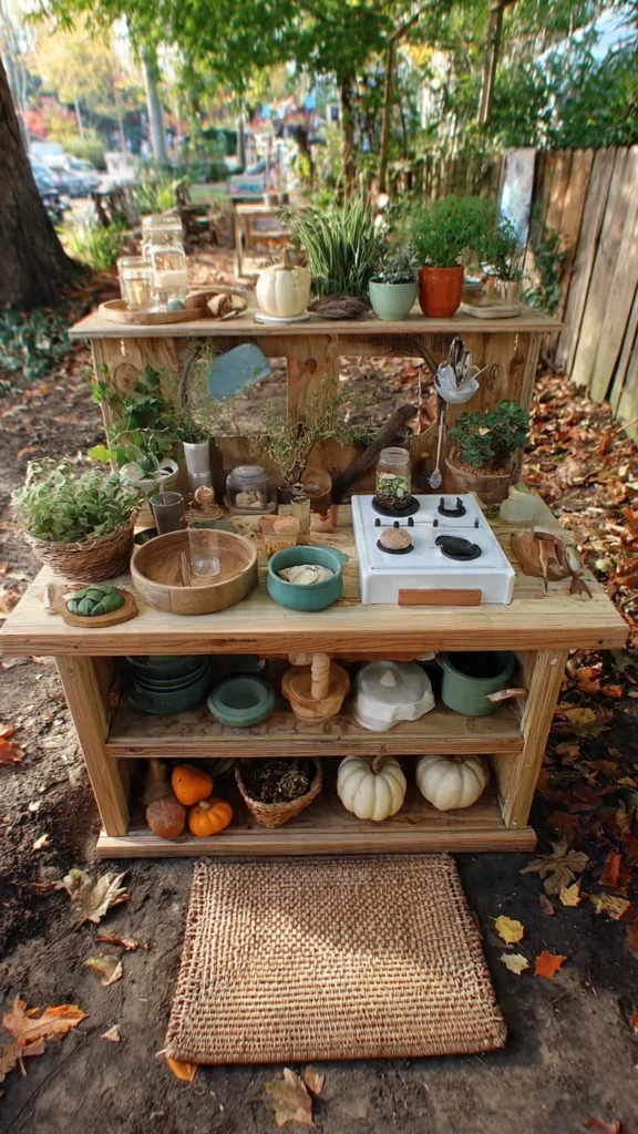 Celebrate the cozy vibes of fall with this stunning “Autumn Café” mud kitchen. Decorated with faux leaves, mini pumpkins, and rustic cooking utensils, this setup captures the essence of seasonal outdoor play.