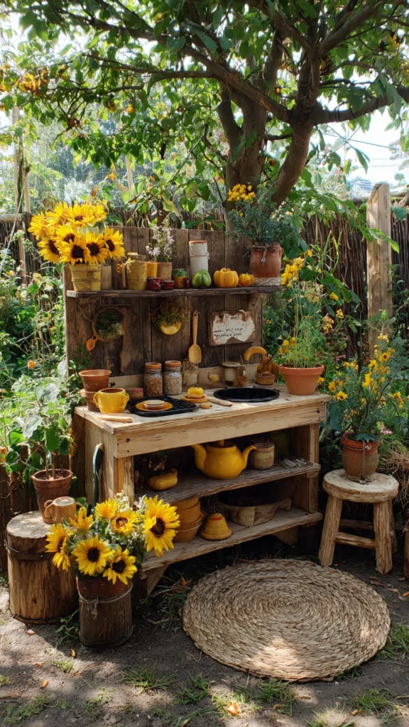 22. Autumn-Themed Mud Kitchen with Sunflowers