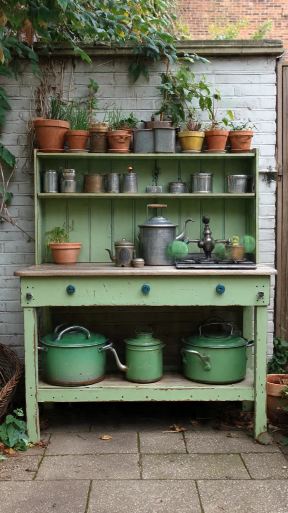 1. Classic Green Mud Kitchen with Vintage Pots