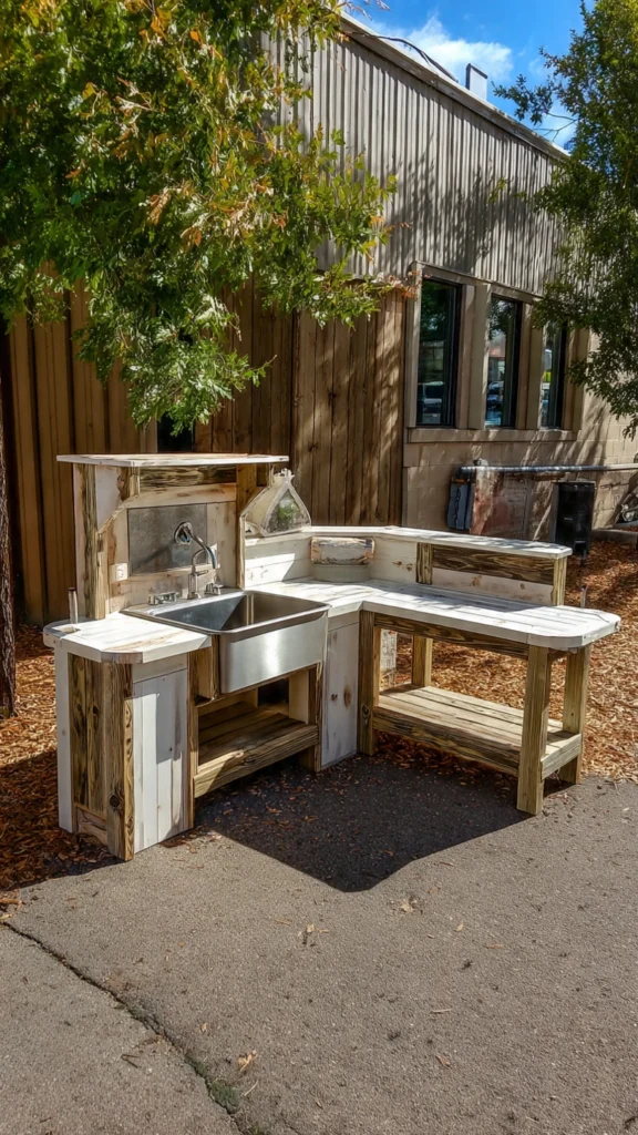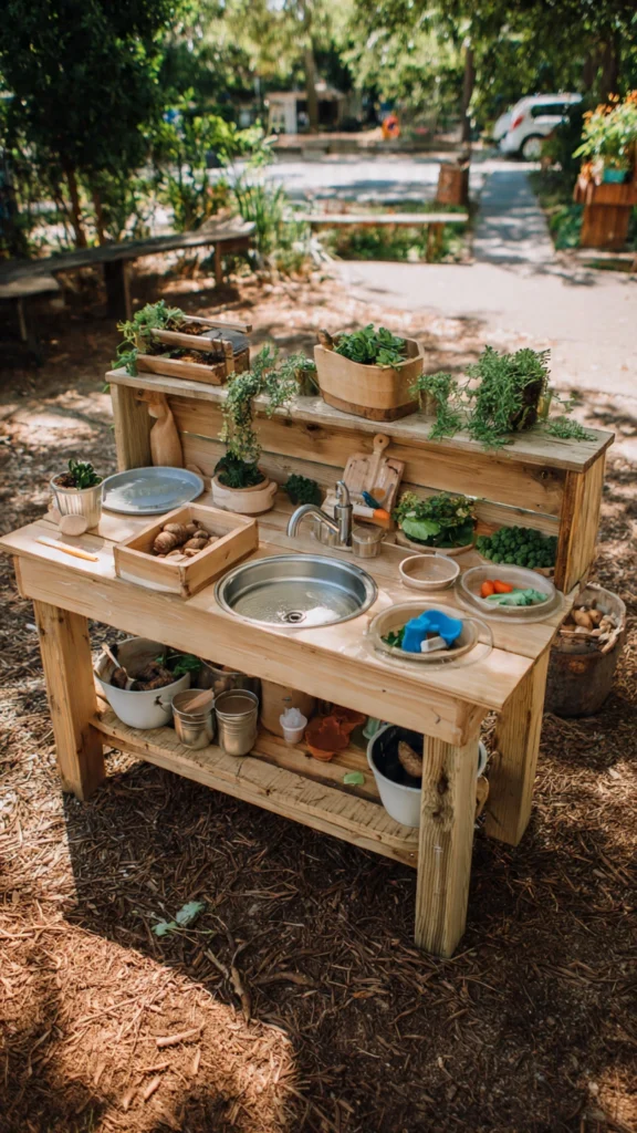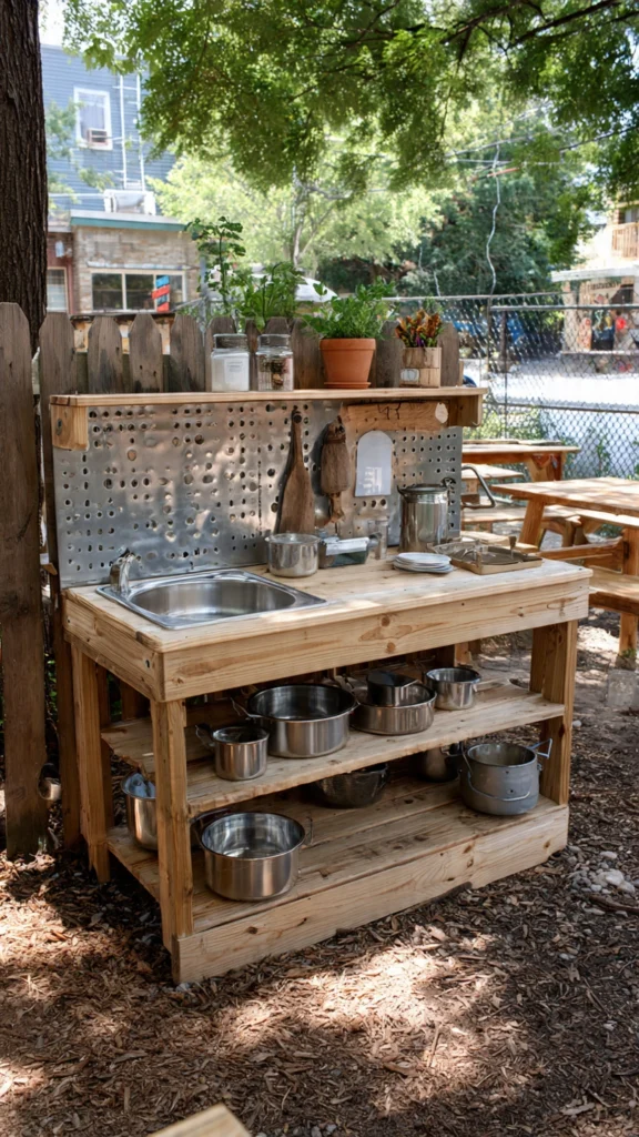 19. Schoolyard-Ready Mud Kitchen with Metal Fixtures