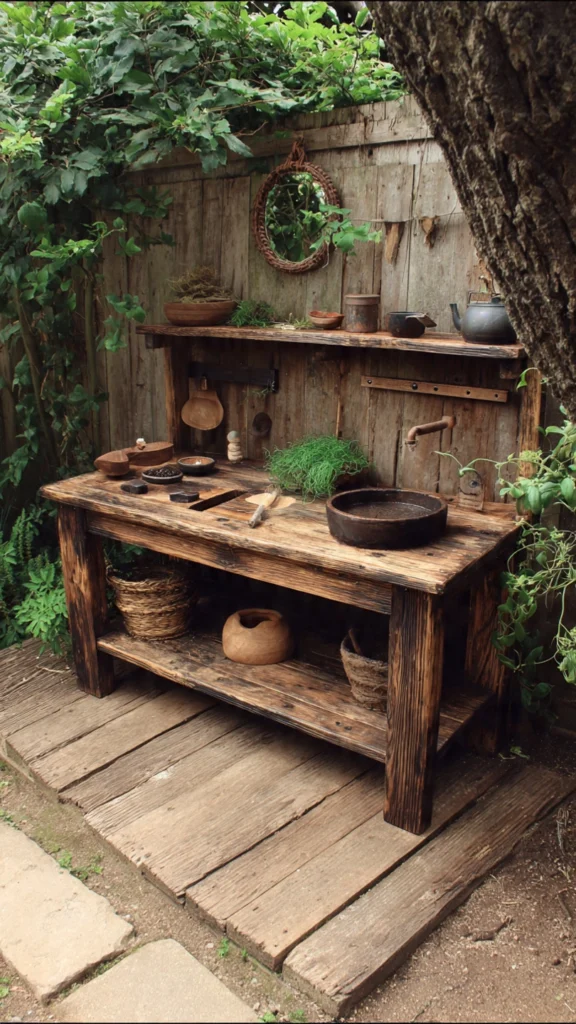 A relaxing nook in the yard becomes magical with this natural wood mud kitchen setup. Featuring twin sinks, real faucets, and a collection of copper and silver pots, this kitchen blends functionality with vintage charm.