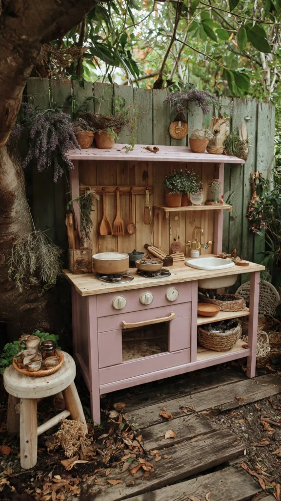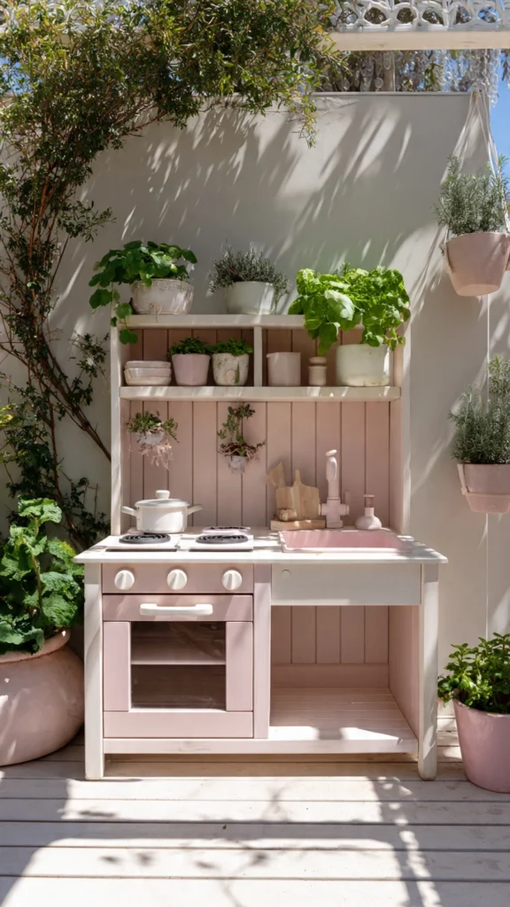 5. Pastel Pink Mud Kitchen with Garden Touches