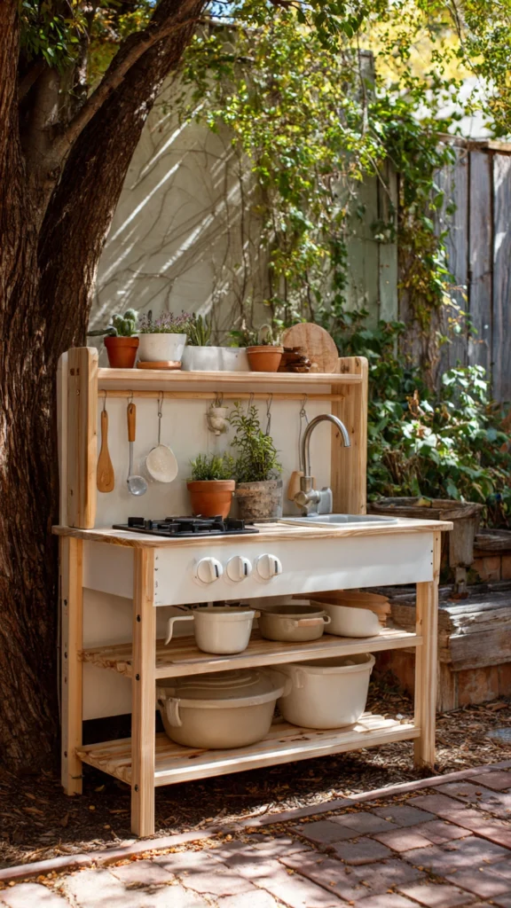 The open bottom shelf displays classic silver pans, inviting kids to mix, scoop, and pretend-cook with imagination. It’s a lovely mix of nature and nostalgia in one outdoor setup.