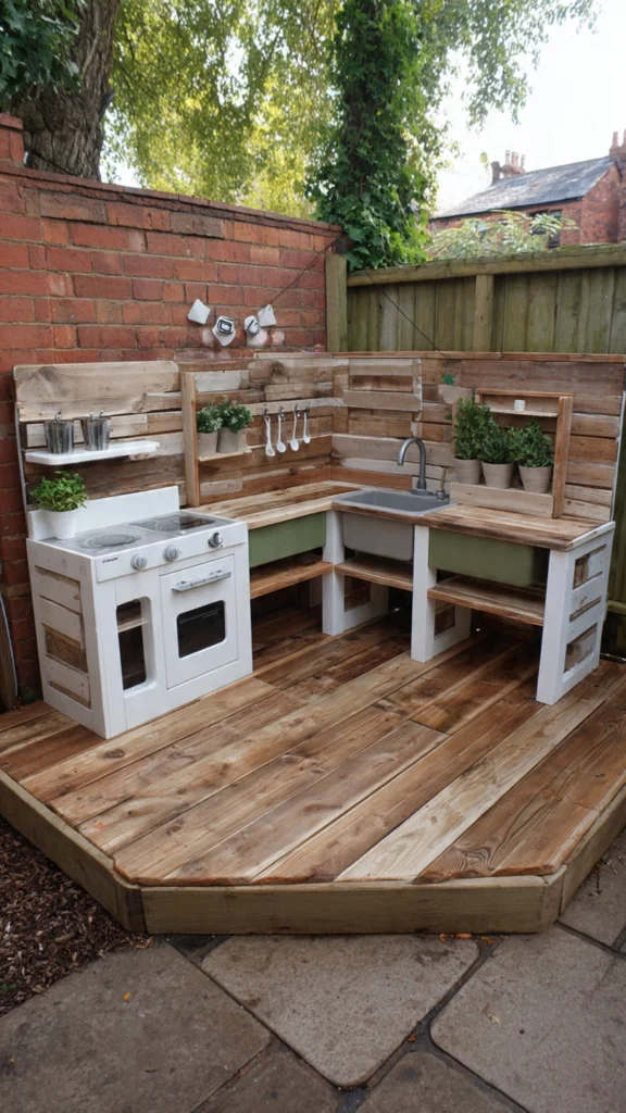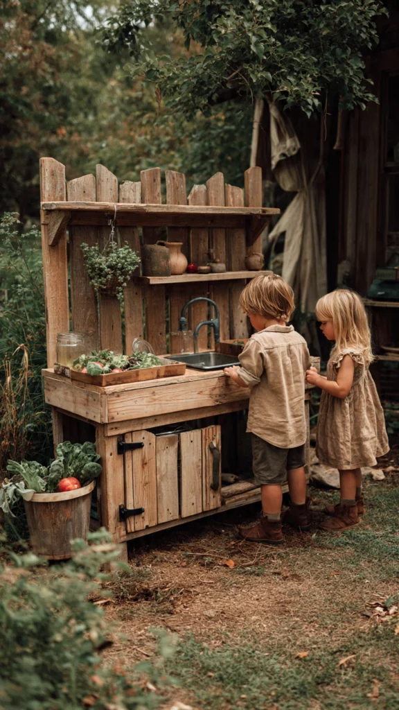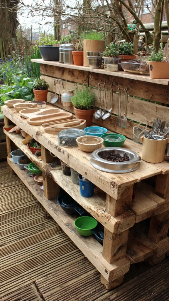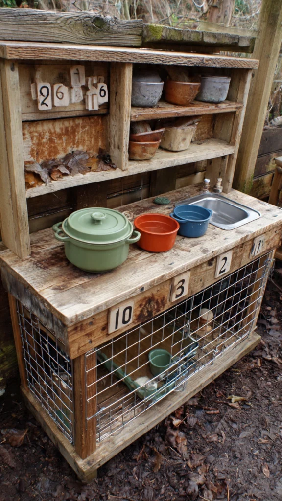 This small but mighty mud kitchen captures the essence of DIY fun. Made from repurposed pallet wood, it features a hand-painted “Mud Kitchen” sign, minimal shelving, and plenty of everyday containers for imaginative use.
