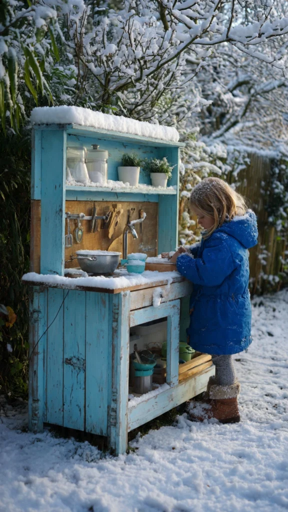 Yes! Mud kitchens can be used year-round. In winter, kids can play with snow, ice, and water, creating frosty soups and cold-weather potions. Just dress them warmly and add waterproof mats.
