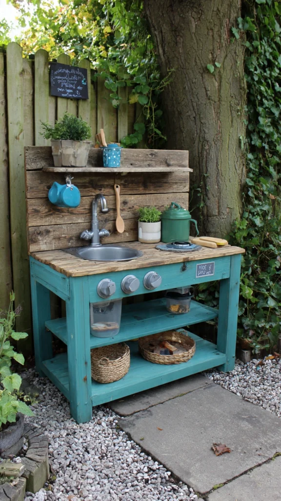 This whimsical teal mud kitchen adds character to any outdoor space with its bold color and seasonal creativity. A chalkboard label reading “Autumn Café” sets the stage for leafy soup adventures.